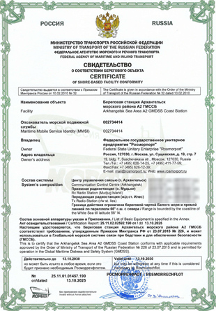 Свидетельство береговой станции Архангельск морского района А1 ГМССБ