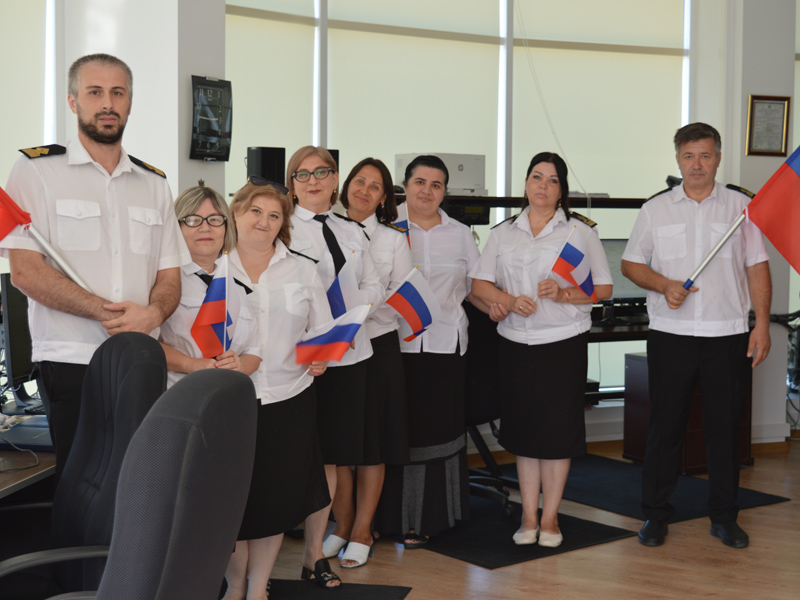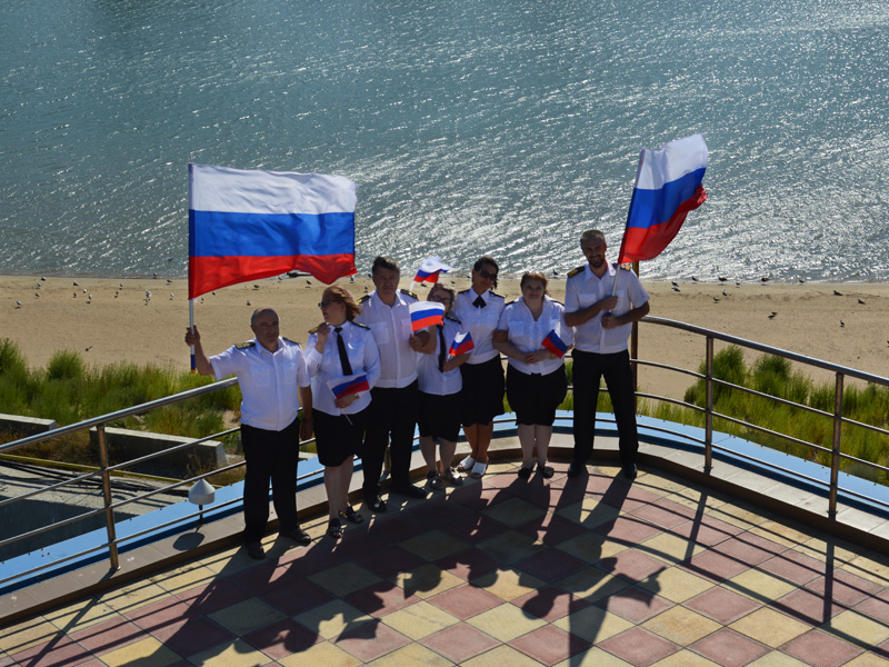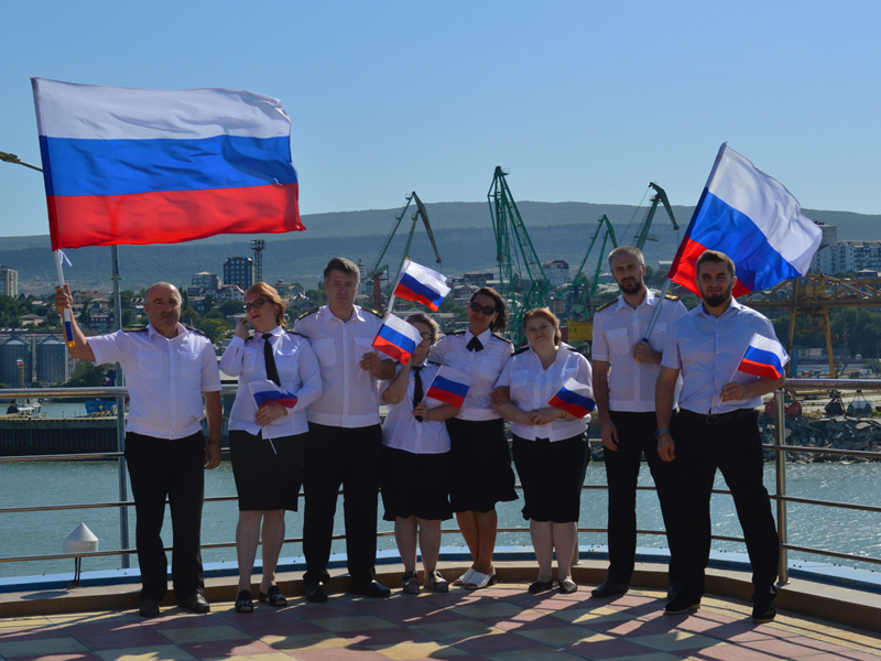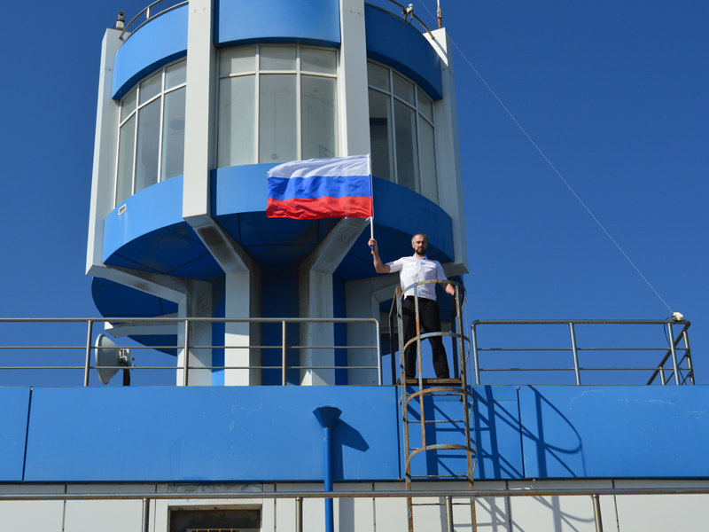 На объектах филиала в морском порту Махачкала, в частности на здании СУДС Махачкала, были подняты государственные флаги Российской Федерации.