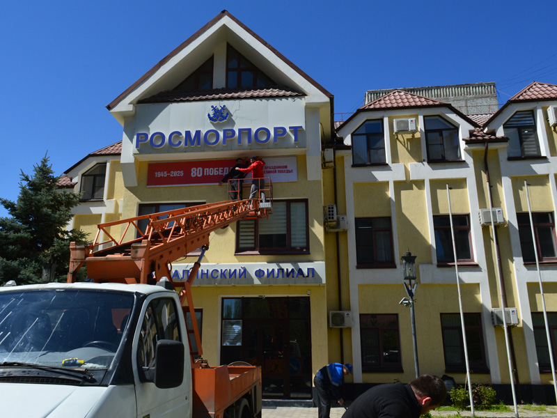 Работники филиала привели в порядок территорию, прилегающую к административному зданию филиала. Непосредственно на самом административном здании разместили праздничную атрибутику, посвященную празднованию 80-летия Победы в Великой Отечественной войне 1941-1945 гг.