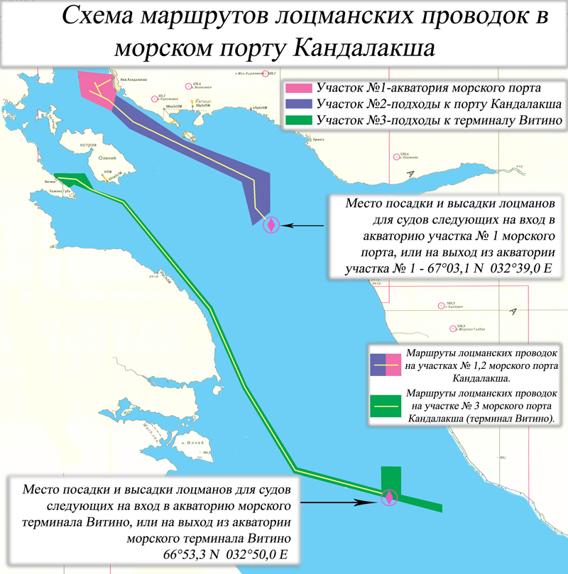 - на участках № 1 и № 2 от места приема/высадки лоцмана в точке с координатами: Ш=67°03,1'N Д=032°39,0'E до мест высадки/приема на причалах морского порта Кандалакша или в районах рейдовых (якорных) стоянок. Маршруты лоцманских проводок и их протяженность прилагаются;