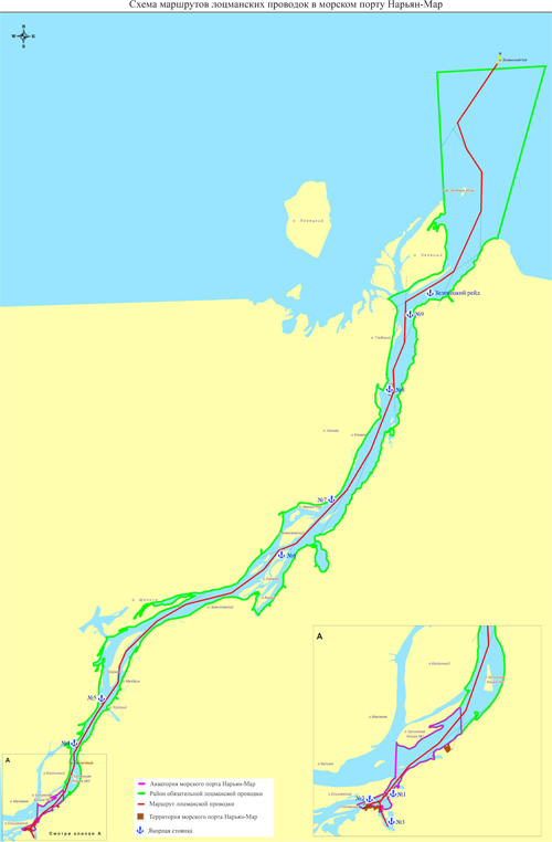 В соответствии с Обязательными постановлениями в морском порту Мезень, утвержденными приказом Минтранса России от 09.07.2014 № 184, районом обязательной лоцманской проводки судов в морском порту Мезень является участок акватории по фарватеру реки Мезень, ограниченный береговой линией правого и левого берегов реки Мезень и линиями, соединяющими точки с координатами: