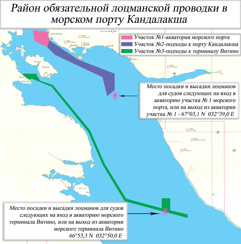- на участке № 3 от места приема/высадки лоцмана в точке с координатами: Ш=66°53,3'N Д=032°50'E, до мест высадки/приема на причалах морского терминала Витино или в районах рейдовых (якорных) стоянок на участке № 3 морского порта Кандалакша. Маршруты лоцманских проводок и их протяженность прилагаются;