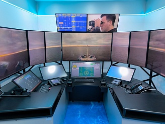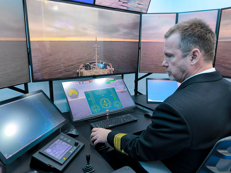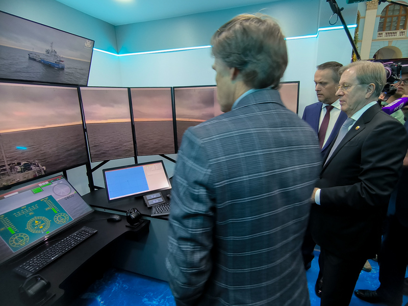 На стенде в ходе прямой трансляции с сопровождающего катера и систем кругового обзора было продемонстрировано дистанционное управление судном, находящимся в акватории Невской губы Финского залива. Виталий Клюев, меняя на пульте курс и скорость, показал возможности маневрирования.