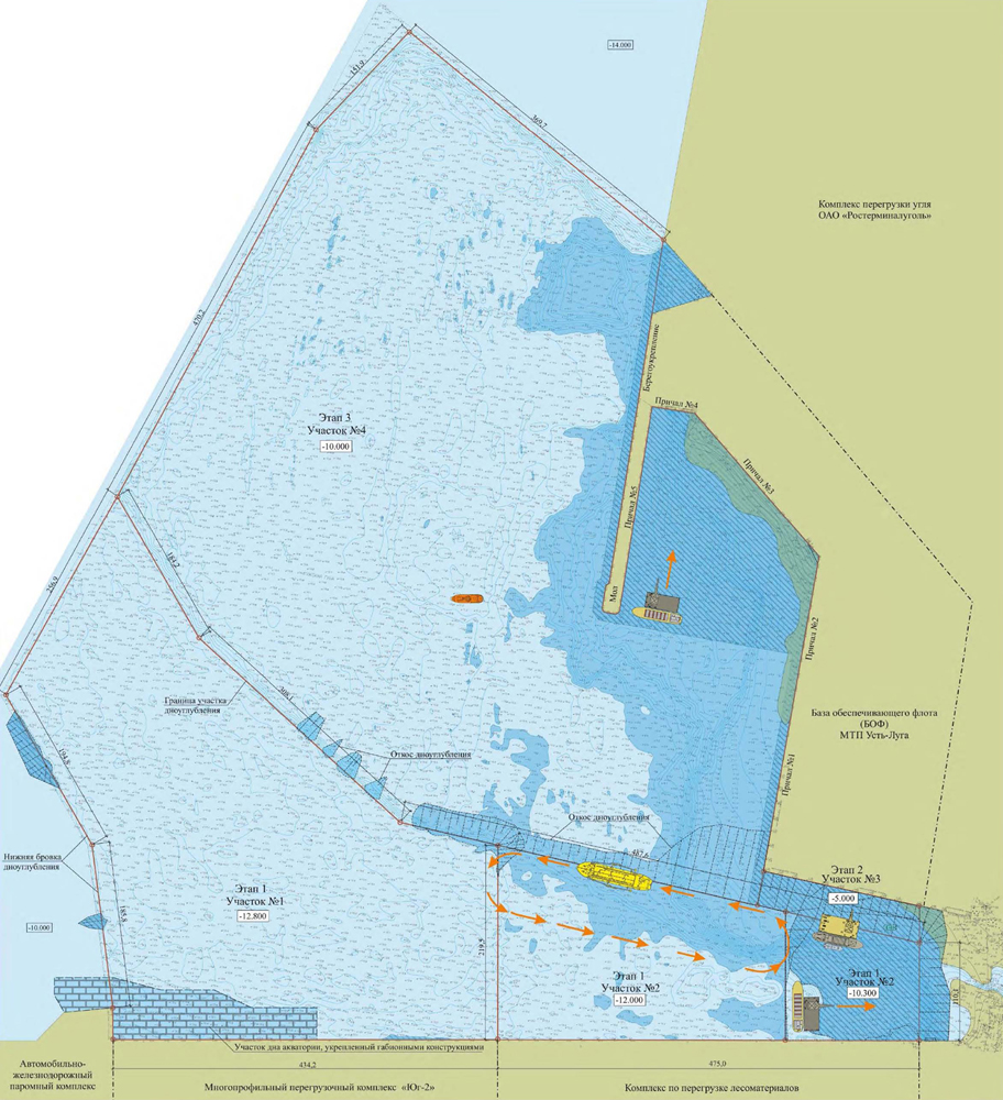 пусковых перегрузочных комплексов (универсального, минеральных удобрений, наливных грузов и части угольного терминала), предназначенной для прохода расчетных типов судов дедвейтом 70 тыс. тонн, что позволило обеспечить заходы судов с осадками до 14 м и водоизмещением до 80 тыс. тонн, а также введен в эксплуатацию реконструированный Южный подходной канал, предназначенный для обеспечения прохода расчетных типов судов к операционной акватории пусковых перегрузочных комплексов (универсального, минеральных удобрений, наливных грузов и части угольного терминала). В ходе реконструкции Южный подходной канал был расширен до 180 м, а отметка дна доведена до -16 м, что позволило обеспечить проход танкеров водоизмещением до 80 тыс. тонн и осадкой в грузу до 14 м к причалам комплекса наливных грузов морского порта.