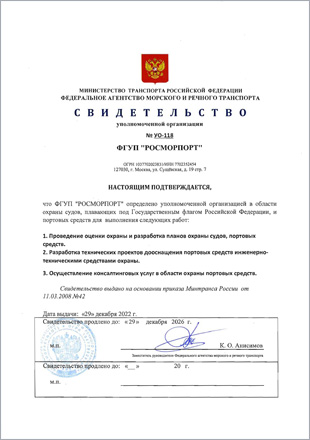• Свидетельство об аккредитации ФГУП «Росморпорт» в качестве подразделения транспортной безопасности