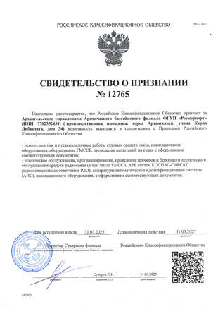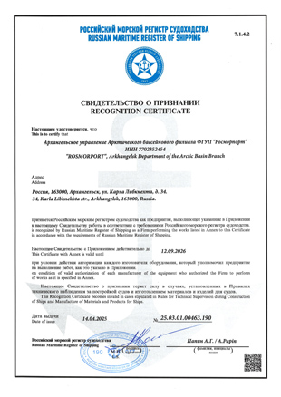 Свидетельство системы управления движением судов Кольского залива высшей категории
