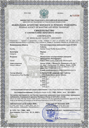 Свидетельство системы управления движением судов Таганрогского залива высшей категории
