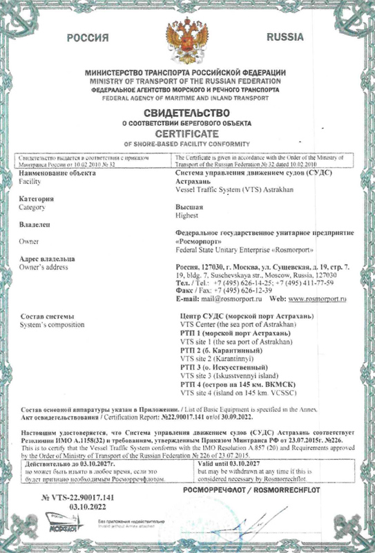 По результатам освидетельствования Росморречфлотом ФГУП «Росморпорт» получено свидетельство от 03.10.2022 № VTS-22.90017.141 о соответствии СУДС Астрахань требованиям резолюции ИМО А.1158(32) и приказа Минтранса России от 23.07.2015 № 226, предъявляемым к СУДС высшей категории.