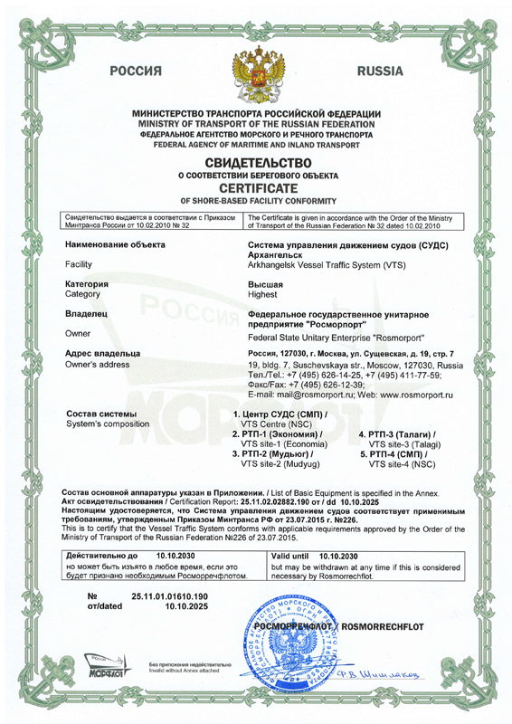 По результатам освидетельствования Росморречфлотом ФГУП «Росморпорт» получено свидетельство от 10.10.2025 № 25.11.01.01610.190 о соответствии СУДС Архангельск требованиям приказа Минтранса России от 23.07.2015 № 226, предъявляемым к СУДС высшей категории.