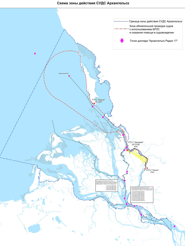 Арктическим бассейновым филиалом ФГУП «Росморпорт» с использованием СУДС Архангельск круглосуточно предоставляются судам комплексные навигационные услуги и осуществляется: