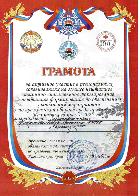 За активное участие в соревнованиях пожарное звено Петропавловского филиала награждено грамотой Министерства по чрезвычайным ситуациям Камчатского края.