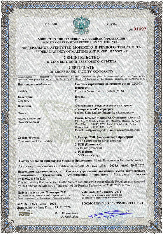 По результатам освидетельствования комиссией Росморречфлота ФГУП «Росморпорт» получено свидетельство от 29.01.2026 № VTS-12/29-3351-2026 о соответствии СУДС Приморск технико-эксплуатационным требованиям, утвержденным приказом Минтранса России от 23.07.2015 № 226, предъявляемым к СУДС первой категории.
