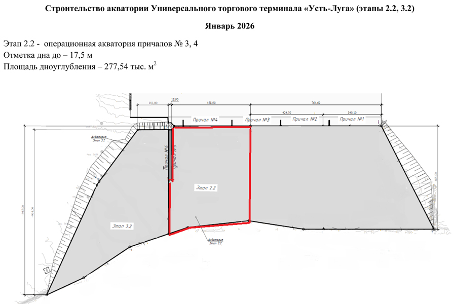 - завершены дноуглубительные работы на операционных акваториях причалов № 1 и № 2 на площади 594,2 тыс. кв. м с доведением отметок дна до -17,5 м и объемом изъятого донного грунта в размере 18,6 тыс. куб. м. Всего выполнено дноуглубительных работ на операционных акваториях причалов № 1 и № 2 на площади 594,2 тыс. кв. м с доведением отметок дна до -17,5 м и объемом изъятого донного грунта в размере почти 5,8 млн куб. м;