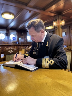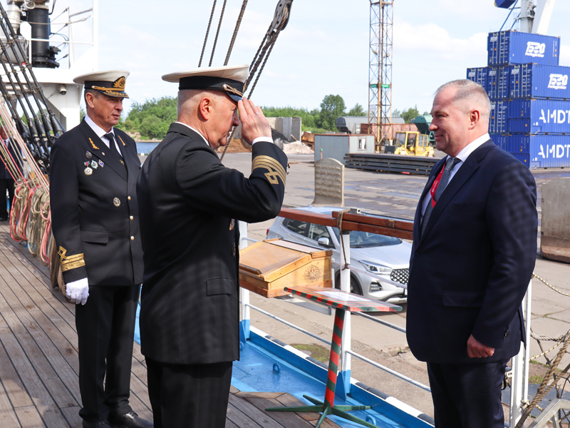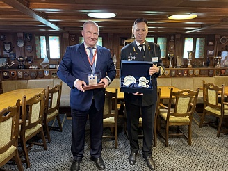 Завершив церемонию подписания, Генеральный директор ФГУП «Росморпорт» и ректор ГУМРФ оставили записи в Книге почетных гостей парусника. В знак взаимного уважения состоялся обмен памятными подарками: Сергей Барышников преподнес Сергею Пылину плакетку с символикой университета, а ФГУП «Росморпорт» в ответ подарило ГУМРФ эксклюзивный сервиз с изображением парусного учебного судна «Мир».