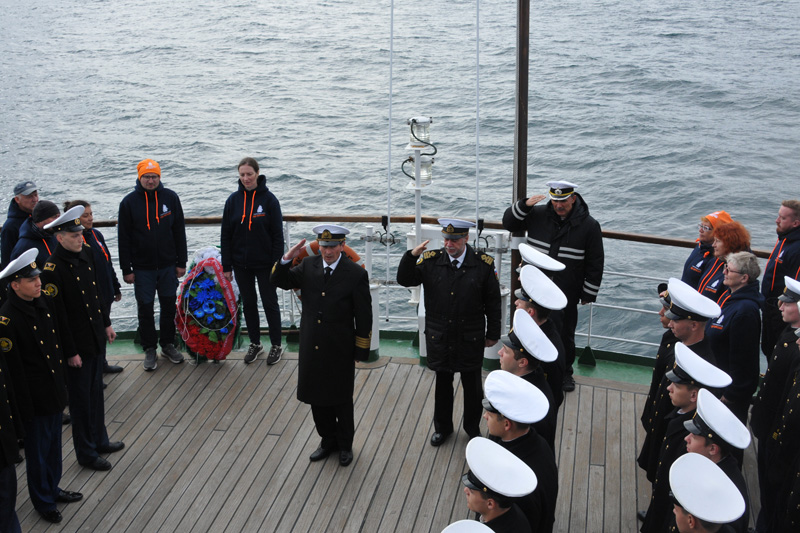 На следующий день в бухте Командор прошла церемония спуска венка с коленопреклонением в честь Витуса Беринга, погибшего на острове во время Второй Камчатской экспедиции в 1741 году.