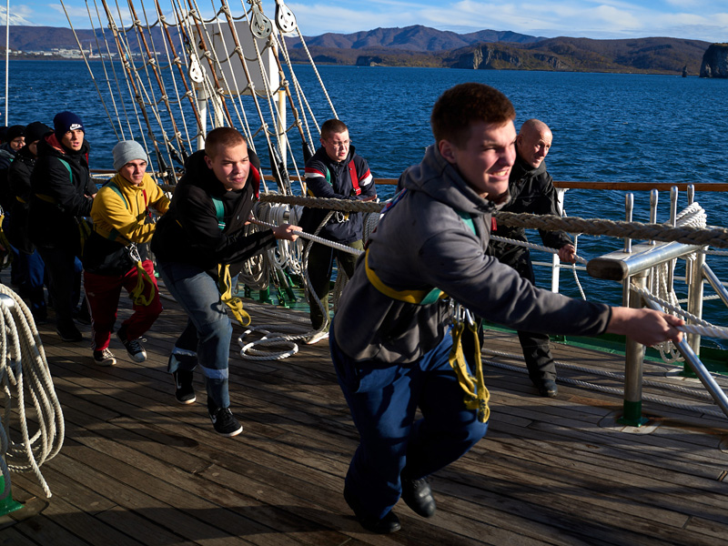 Кроме того, парусник подошел к Шантарским островам в Охотском море и встал на рейд в расположенной неподалеку бухте Врангеля. На судне побывали ученые, изучающие гренландских китов. Биологи прочитали практикантам лекцию о морских млекопитающих, которые регулярно встречаются в здешних местах.