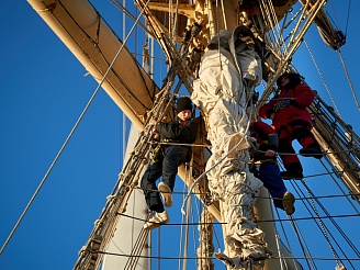 «На практике я поборол страх высоты, научился работать со снастями, завязывать морские узлы, узнал, что такое укатка парусов, как устроено машинное отделение, какие обязанности у вахтенного механика или матроса. Но главное – понял, что морская профессия мне точно подходит, а все трудности – качка, крен – только укрепляют. Время пролетело быстро, хотелось бы вернуться и повторить переходы между морскими портами и островами уже в качестве члена экипажа», – поделился впечатлениями Михаил Изотов, курсант 2-го курса судомеханического факультета МГУ им. адм. Г.И. Невельского.