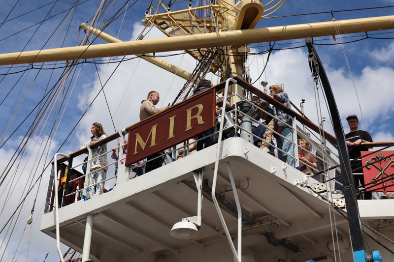 Бьет ключом и культурная жизнь фрегата. В 2025 году «Мир» сыграл главную роль в масштабных морских фестивалях – «Морская неделя» в г. Пионерском и «Открытое море» в г. Калининграде, а также принял участие в Петербургском международном экономическом форуме.