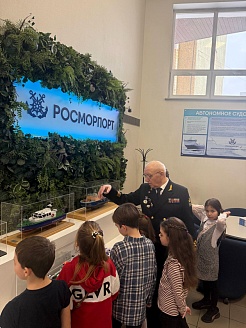 Помощник Генерального директора ФГУП «Росморпорт» Владимир Штрамбранд, подчеркивая преемственность поколений и величие морской державы, провел для юных гостей увлекательную экскурсию по офису, в ходе которой продемонстрировал модели ключевых судов предприятия: ледоколов, земснарядов, парусников, подробно рассказав об их роли в обеспечении безопасности мореплавания. Он также прочитал ребятам небольшую лекцию об истории праздника и его значении в современном мире. В завершение встречи, как символ верности воинскому долгу и чести, детям был показан фрагмент из фильма «Офицеры» 1971 года.